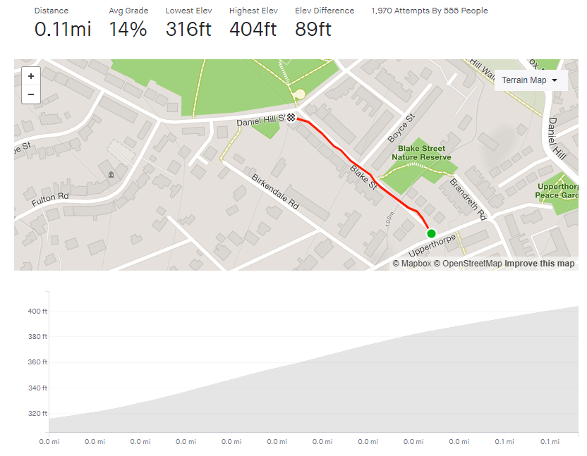 Facing the far more difficult Kent Road, this is its own unique challenge, with both a higher average and peak gradient than its neighbour. At only 184 feet long, it’s not time consuming, just make sure you do it when there isn’t someone coming down the path.